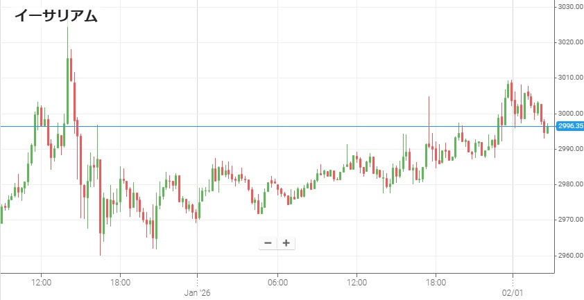 元日で取引量が少ないながら、イーサリアムもビットコインと同様に緩やかな上昇相場となった。31日夜から1日未明にかけて多少下げて一時46万3000円をつけたレートは、その後1日日中から夜は上昇。2日東証には47万円を回復した。(注:チャートは米ドル表記です)