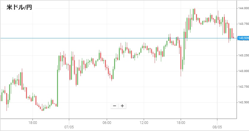 米政策金利発表前の様子見ムードが強かった7日の米ドル/円はあまり動きがなく、1ドル=143円台前半で推移。そして8日未明になってもわずかに円安に動いた後、FOMC発表前にトランプ大統領が「関税を下げない」と発言したことで米ドルが売られて一時143円を割った。だがFOMC発表後には円安に転換し、午前3時半からのパウエル議長の会見で追加利下げに慎重な発言があると米ドルが一段と買われて一瞬だけ144円をつけた。