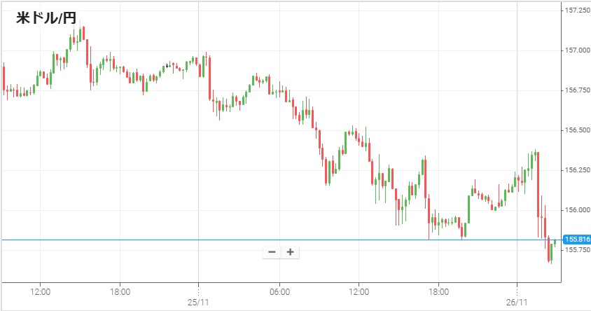 すでに述べたようにFRBの利下げ観測後退や高市政権の政策への懸念などから先週前半までは急激な円安が進行してきたが、先週末や今週になってからFRB幹部が早期追加利下げを支持する発言を行ったことで為替の地合も変わった。朝方に1ドル=156円90銭だった米ドル/円は日中から夜を通して円高・米ドル安が進行。夜には多数の米経済指標が発表されたが軒並み予想を下回ったため、米ドル売り地合は変わらず、発表後には155円台まで下落した。