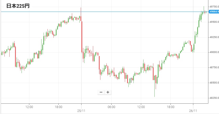 先週金曜と日本が休場していた24日月曜にNY株式市場が上昇したことで、3連休明け25日の日経225平均は488円高の49,113円で寄り付いた。しかし最近になって円安が一服したことから場中は軟調な展開となり、前場から後場にかけて下げが続き終値は34円高の48,659円だった。夕方以降の先物はしばらくの間48,000円台後半で推移した後、26日早朝になると上昇した。