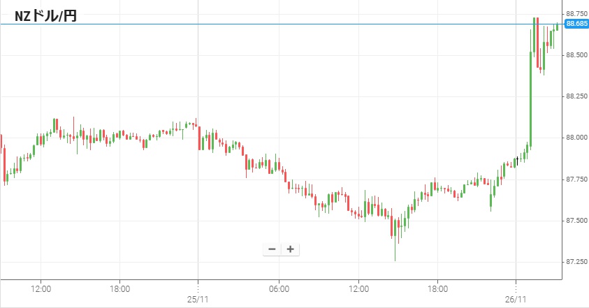 NZ中銀が26日午前10時に政策金利を発表し、予想通り0.25%の利下げが発表されて金利は2.25%とされた。また同時に発表された声明では、追加利下げに対し消極的な文言があった。25日日中は円高に動き一時は87円30銭をつけたNZドル/円は、その後夜から26日未明にかけて緩やかな円安が進行。そして26日午前にNZ政策金利が発表され追加利下げに消極的な文言があったために発表後に急騰し、一時88円70銭をつけた。