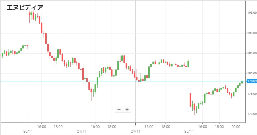 エヌビディアは10月末に時価総額が5兆ドルを超えたが、その後は一転して下げが続いている。また先週は8~10月期決算を発表し良好な内容だったものの、下げを止めるに至っていない。26日はFacebookのメタ社がグーグル製の半導体を採用する検討をしていると報じられたことが売り材料となり、序盤に一時約7%安の169ドル台まで下落。だがそこで下げ止まりその後は反発し、終値は2.6%安の177.82ドルだった。