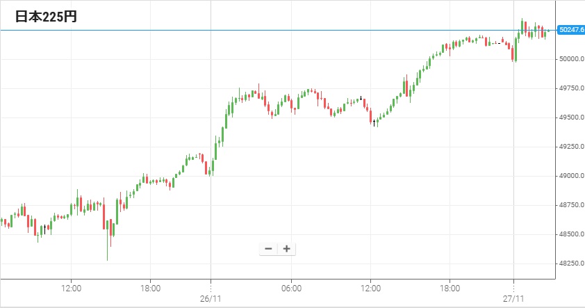 FRBの利下げ観測後退で先々週後半から先週中盤までは大きく下げてきた株式市場だが、先週終盤以降に利下げ観測が再燃したことで地合が回復している。26日の東証では日経225平均は353円高の49,012円で寄り付き、前場に大きく上昇して49,500円を突破。後場開始直後には一時上げ幅が1,000円を超えたもののその後は49,500円付近で横ばいが続き、終値は900円高の49,559円だった。