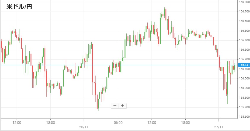 すでに述べたように先週金曜から今週にかけてFRBの幹部数名が早期追加利下げに積極的な発言をしたことで、それまでの急激な円安が止まり今週の米ドル/円はやや落ち着いた動きとなっている。26日朝方には1ドル=156円台前半にあったレートだが、午前中に日銀が12月の会合で利上げを発表するとの観測が流れて155円70銭まで下落。その後は午後から夕方過ぎにかけて156円70銭まで円安になり、27日未明は156円台前半に留まった。