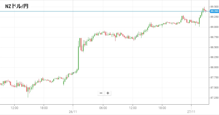 NZ中銀が26日午前10時に政策金利を発表し、予想通り0.25%の利下げで金利は2.25%とされた。一方同時に発表された声明では、利下げサイクルを停止すると示唆する文言があった。26日朝方に1NZドル=87円台後半だったレートは、政策金利発表と声明を受けて1円ほど円安・NZドル高が進行して88円台後半に。その後も利下げ停止観測を受けて緩やかにNZドル高が続き、夜には89円を超えて27日未明は89円台で推移した。