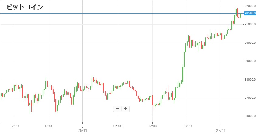 リスク回避の流れが金融市場に広がったことで先週まで下げが続き先週金曜には1,200万円台をつけたビットコインだが、今週は反発している。26日日中は1,350~1,370万円の狭いレンジに留まっていたレートは、27日未明に数十万円急騰して1,400万円を回復。27日午前中には1,430万円を超えた。また米ドル建てでも27日になってからの上昇で節目の9万ドルを回復した。(注:チャートは米ドル表記です)