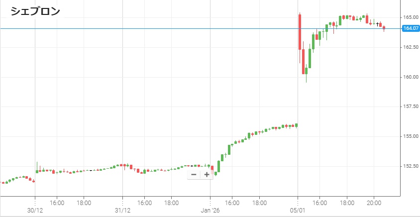 ベネズエラの事件を受けても原油価格は大きく上昇しなかったのに対し、NY市場の石油関連株は上昇した。石油企業のシェブロンは先週を155.90ドルで終えていたが、週明け5日はベネズエラの事件を材料に序盤から大幅上昇。一時は上げ幅が6%を超え、終値は5.1%高の163.85ドルだった。